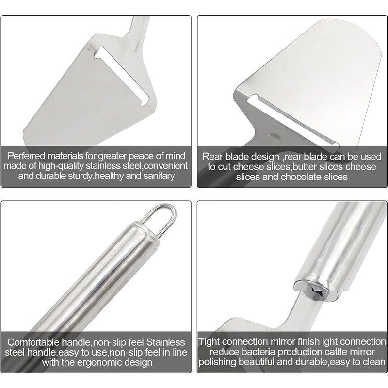 You can also use this plane slicer to shave your delicate chocolates or soft butter. The mouth of the cheese spatula slicer , with the sharp-angled blade, ensures thin, and even slices. The rounded handle is sturdy, balanced, and comfortable so the shape fits perfectly in the palm of your hands for precise slicing and effortless work. Adjust the angle at which you are holding the slicer to change the cheese thickness of the slices that you prefer. It also has a hanging loop attached to the end of the handle for easy access and storage. When you slice fresh cheese, the cheese comes into contact with the oxygen in the air, which helps the cheese to reach its maximum capacity in flavor, Bon Appetite!